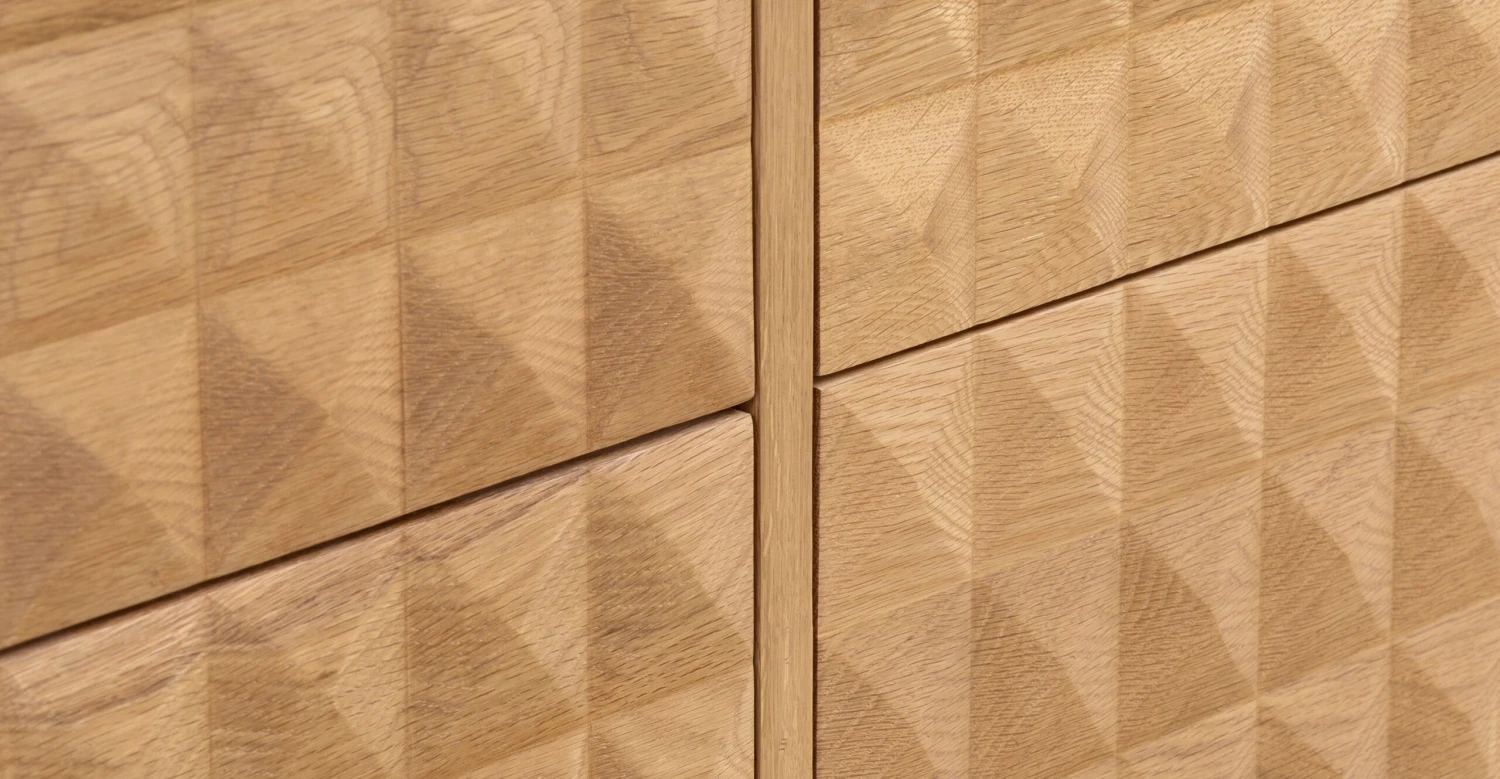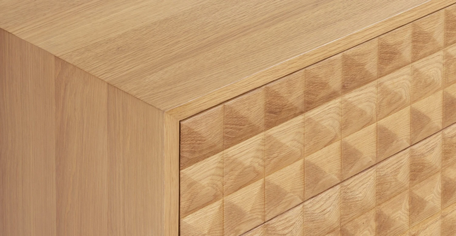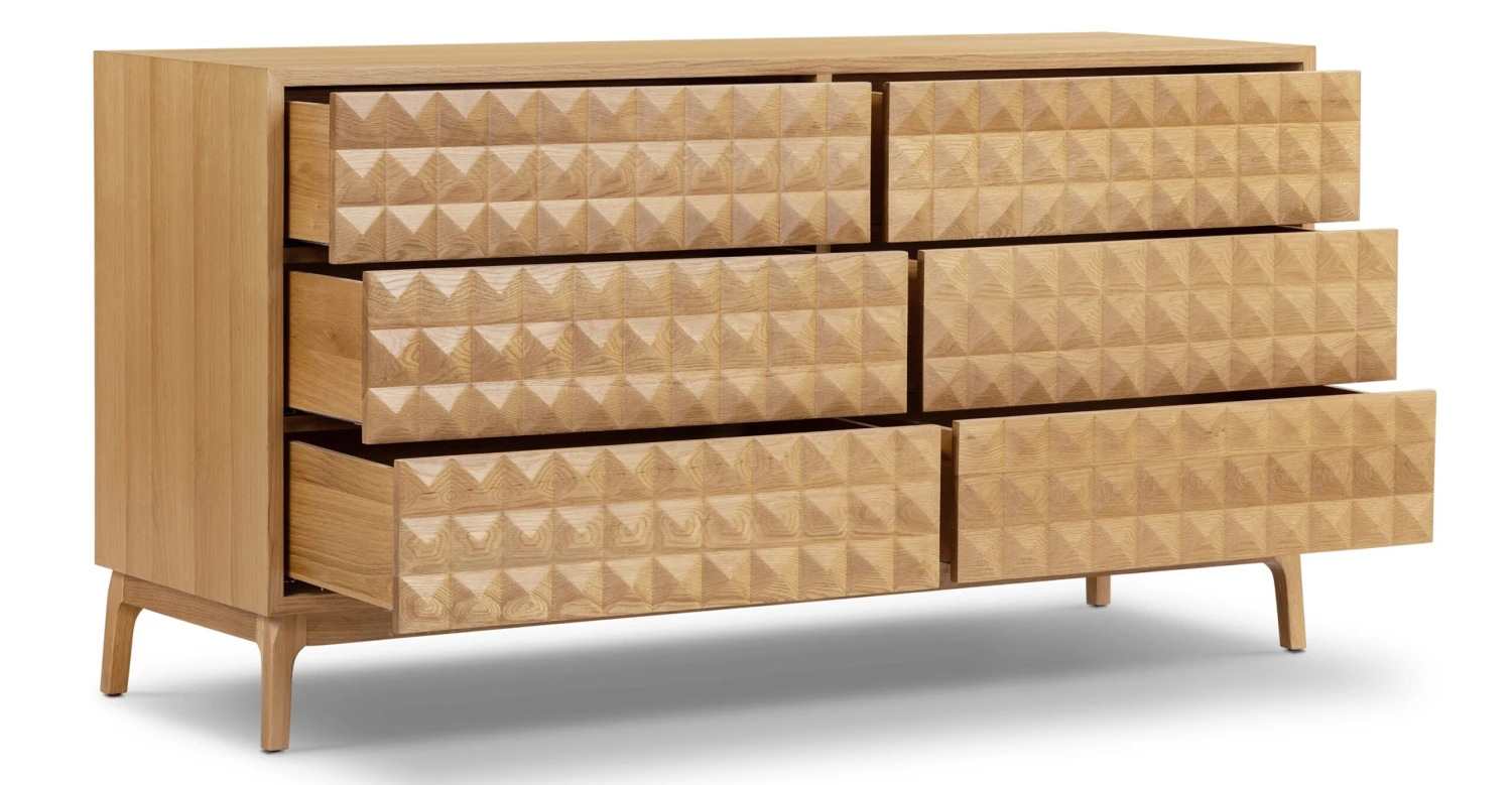 The Abbie Dresser is a stunning fusion of midcentury charm and contemporary design. This dresser embodies the perfect blend of functionality and style, featuring six spacious drawers to accommodate all your storage needs. The standout feature is its pyramid wood façade, showcasing a mesmerizing pattern that adds depth and texture to the piece. With its distinct midcentury feel, this dresser brings a touch of nostalgia and sophistication to any bedroom or living space. Crafted with meticulous attention to detail, this dresser effortlessly combines form and function, making it a timeless addition to your home décor.