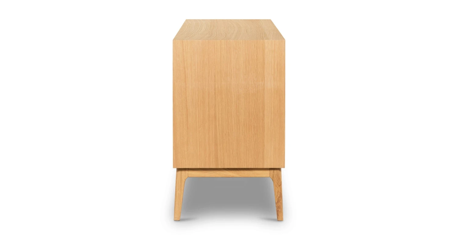 With its unique pyramid wood façade, our Abbie Sideboard aims to house your most treasured dining pieces in style. Three doors with soft close hinges ensure you’ll never disrupt your dinner party with a slamming cabinet door, and the adjustable height shelves allow your stemware and plates to live in harmony. A low profile and gorgeous wooden, tapered legs exude the mid-century modern style you’ve been dreaming of.