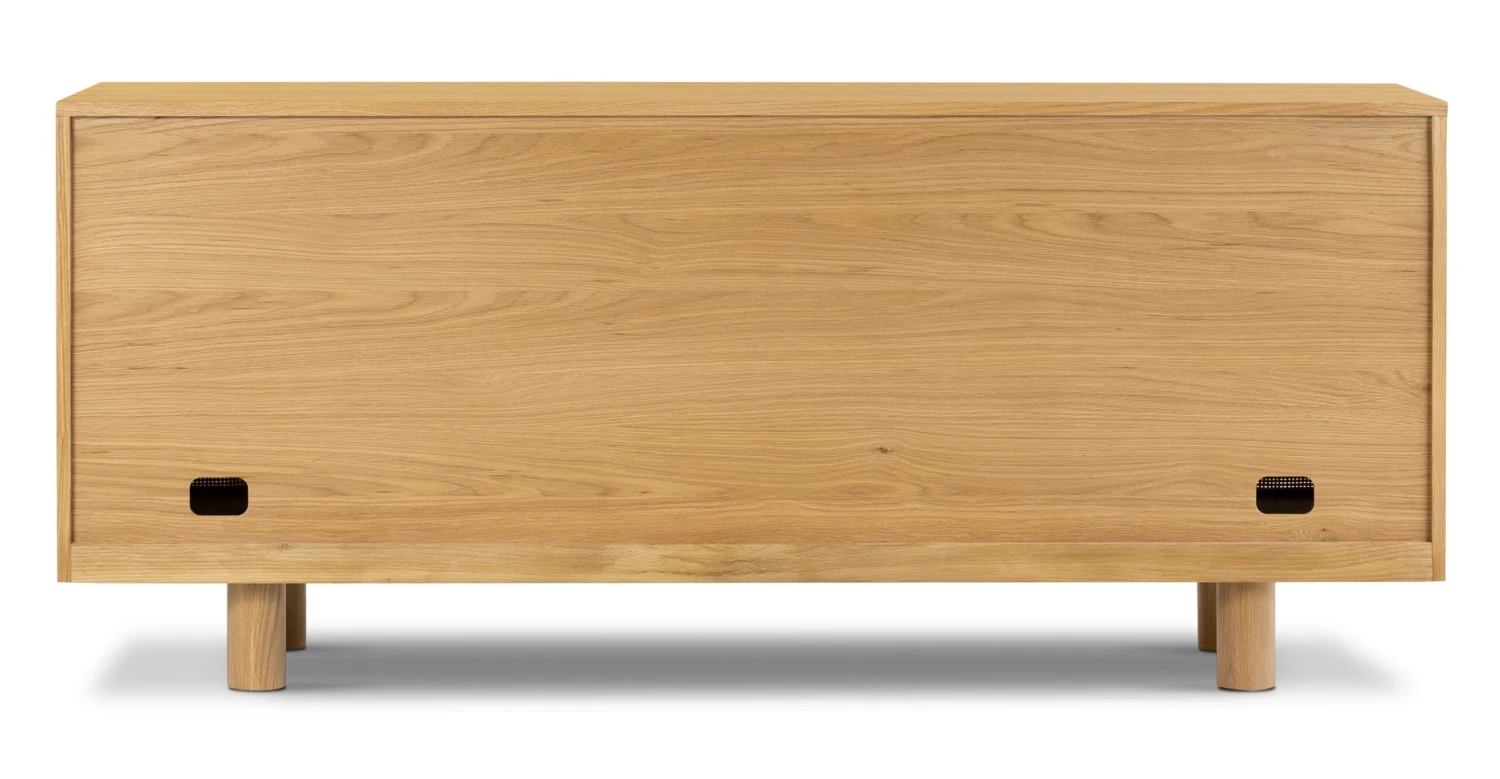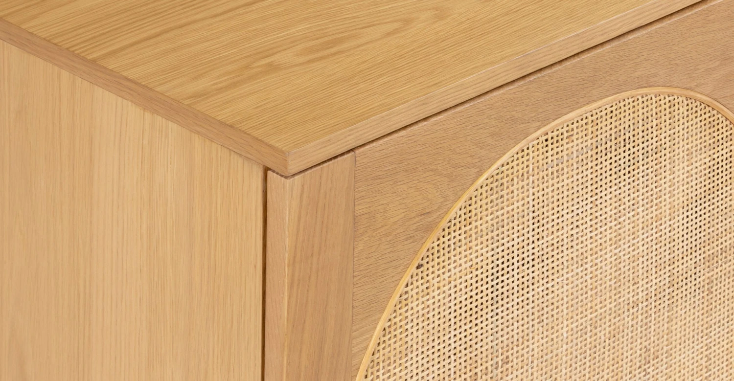 Much like the many arched doorways of Italy, arches adorn the doors of our Archi Sideboard to perfection. Crafted from solid and veneered American white oak with cane webbing door fronts, this sideboard is a showstopper capable of many things— but excels at housing your most treasured collections. Three cabinets open to ample storage space for entertaining and serving pieces, board games, or your irreplaceable vinyl albums.