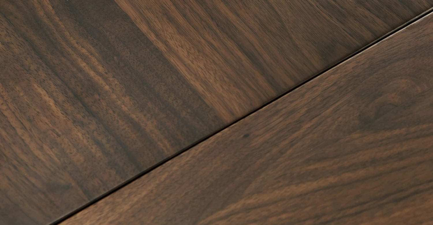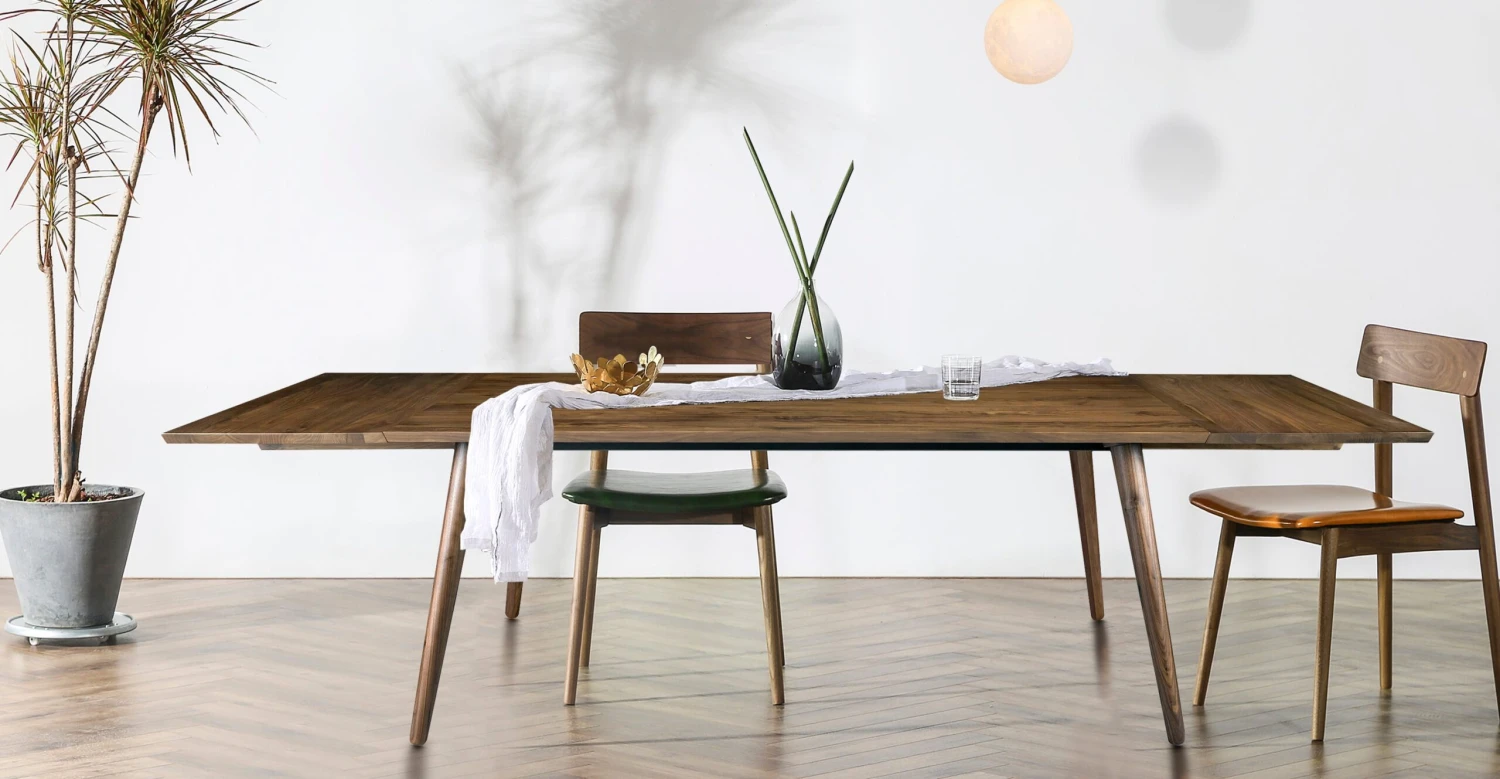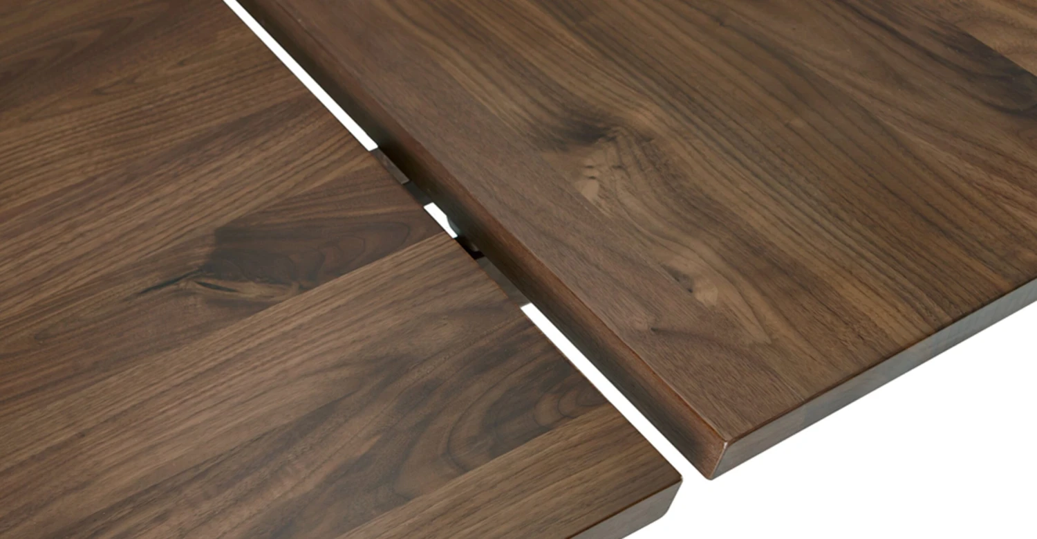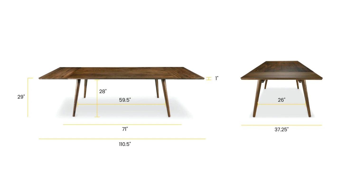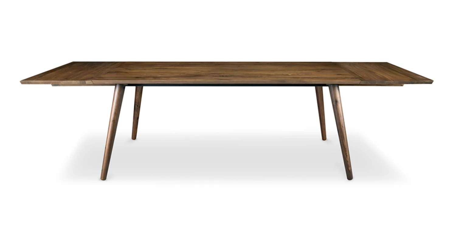Dinner parties and big family breakfasts serve up inviting ambiance with this retro-influenced yet contemporary dining table featuring attachable extension leaves at each end for guests. (FYI – extension leaves store separately). Crafted from solid American black walnut or solid American white oak wood that highlights a rich natural grain, it boasts crisp lines and eye-catching angles. Rounded tapered legs splay slightly to provide sturdiness and create ample room for 10 dining chairs to fit comfortably and 12 in a pinch, lending spacious appeal to every gathering.