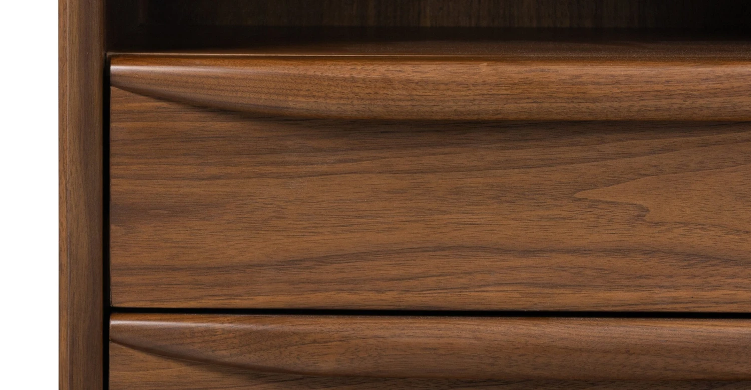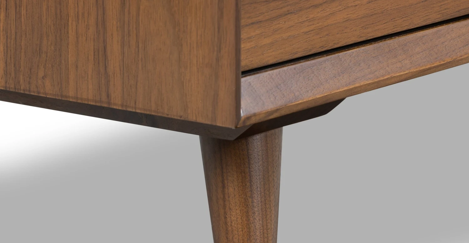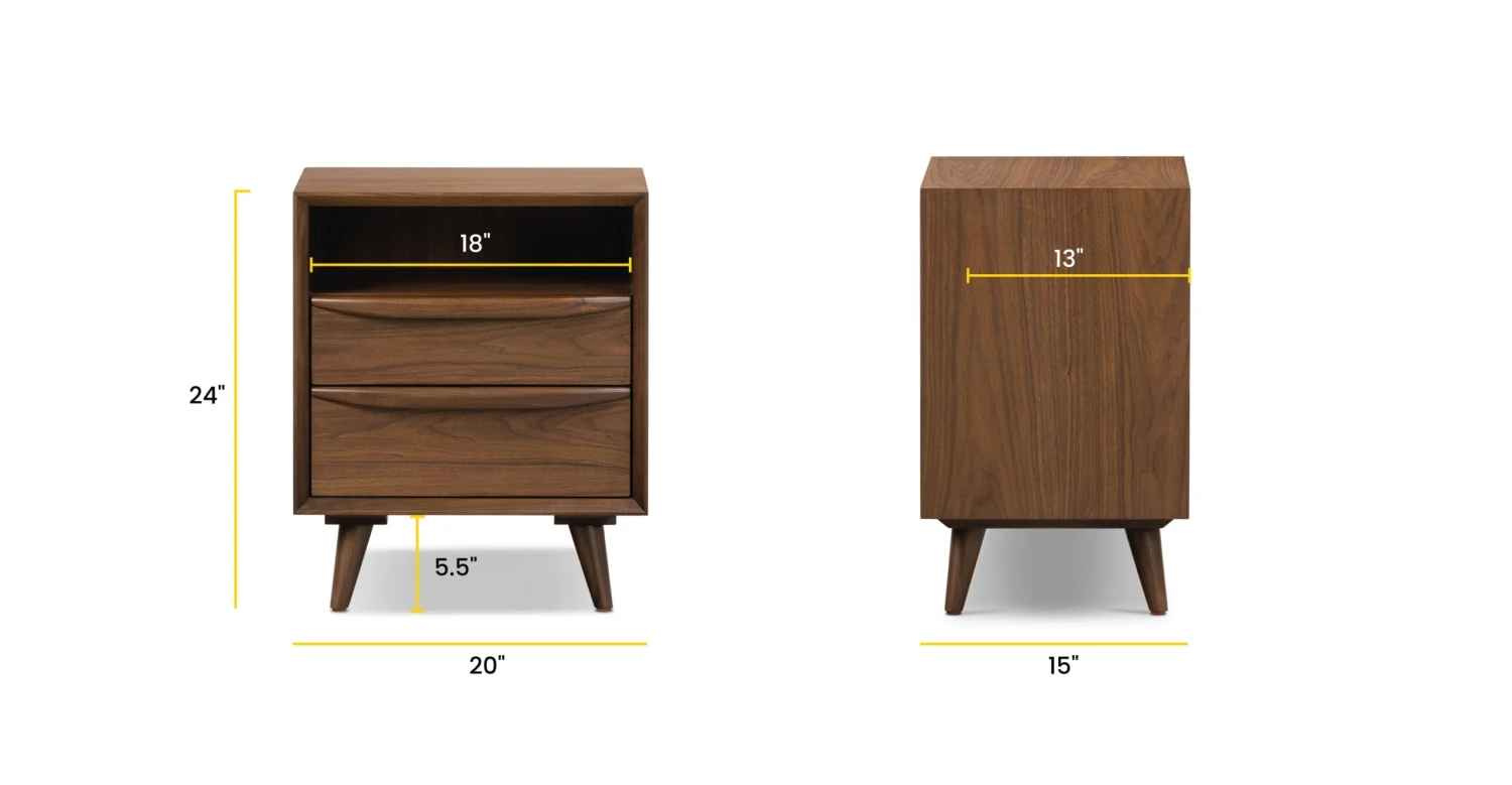 Introducing the captivating Cura nightstand, a stylish and functional midcentury-inspired piece. Crafted from exquisite walnut wood, it radiates timeless elegance. Soft close drawers provide whisper-quiet storage for nighttime essentials. Splayed legs offer stability and retro charm. With one shelf and two spacious drawers, it offers ample storage for books and personal belongings. The long, solid wood handle adds a refined touch, ensuring easy access to your cherished items.