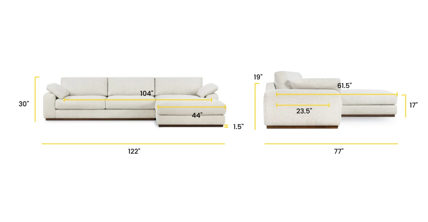 Seat depth with seat back cushions in place: Loveseat 23.5″ , Chaise 61.5″