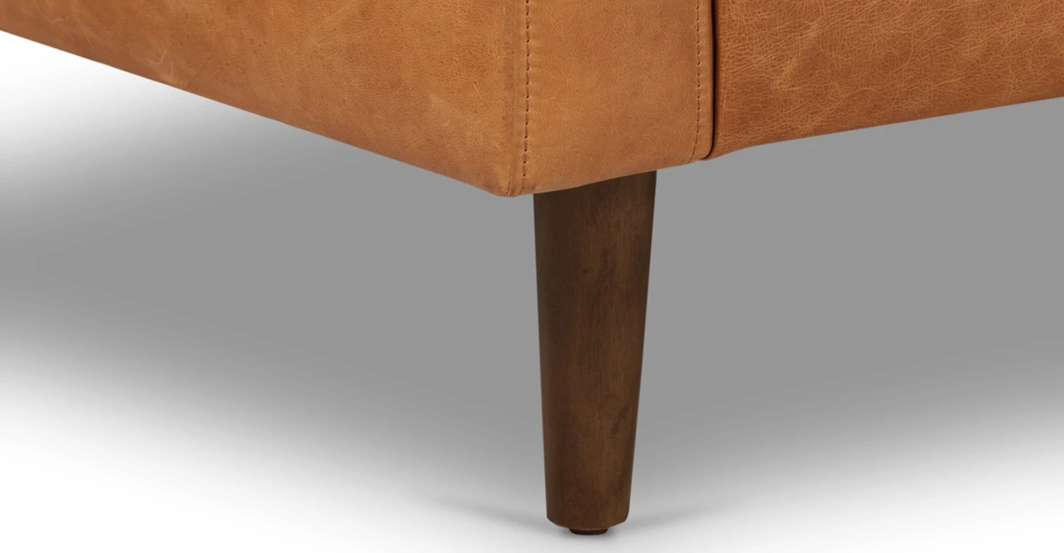 Materials: Full-grain pure-aniline (cognac tan, nightfall blue) or semi-aniline (other colors) dyed leather, Kiln dried solid wood, high-resiliency foam, polyester, duck feathers