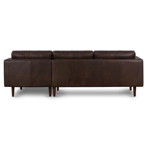 Relax and rejuvenate in the stylish comfort of this full grain pure-aniline (cognac tan, cocoa brown) or semi-aniline (all other colors) leather Napa sectional sofa, which boasts a full chaise for optimal relaxation. The gorgeous Cognac tan pure-aniline dyed Italian tanned leather upholstery creates a unique presentation for each piece, showing off the natural characteristics and varying depth of color in each hide. With minimal processing, aniline hides proudly display the natural hallmarks of genuine leather such as fat wrinkles, growth marks, healed scars, insect bites and scratches. Similar to marble or a beautiful piece of timber, each leather will vary in color tone and pattern and will change, mark and stain, softening into its rich patina with age. Delivering exceptional craftsmanship, the sectional features a kiln-dried solid wood frame with reinforced joinery and corner blocking for added strength and durability. Designed both for style and beauty, the chair features Pirelli webbing to support its seat and back, with high density foam over polyester filling to provide just the right amount of support. Duck feather down adds appealing softness and a pair of loose bolsters are included, providing classic style and added support as desired.