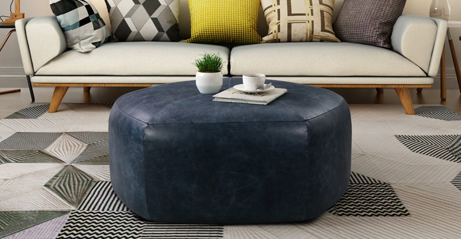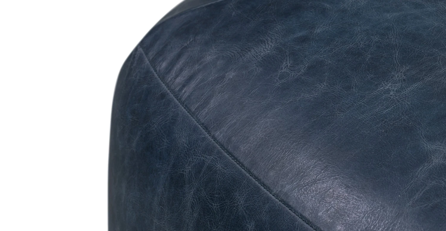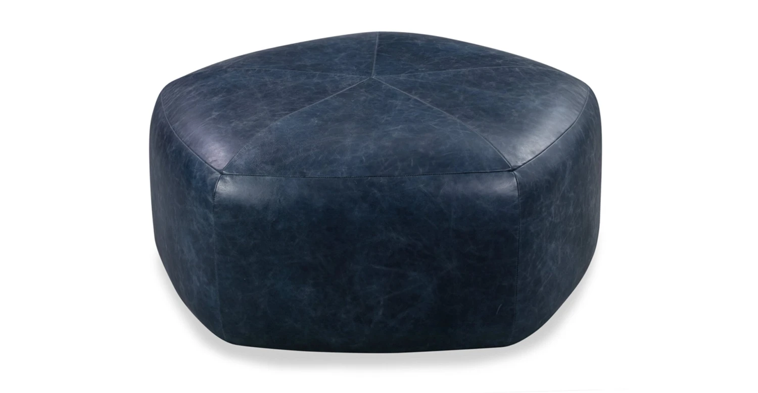 From every angle, this versatile ottoman is designed to delight the informed eye. Its unique pentagon profile offers a comfy accompaniment for your sofa, easy chair or as an accent table when layered with a chic serving tray. Its rubberwood frame is corner blocked for sturdiness, forming the foundation for its feather down blend surface topper. Its buttery Italian tanned leather upholstery is pure-aniline dyed in the cognac tan color to accentuate the hide’s natural scuffs, scratches and textures, which help it patina nicely. Exquisite star-like stitching brings out the geometric genius of this stylish footrest.