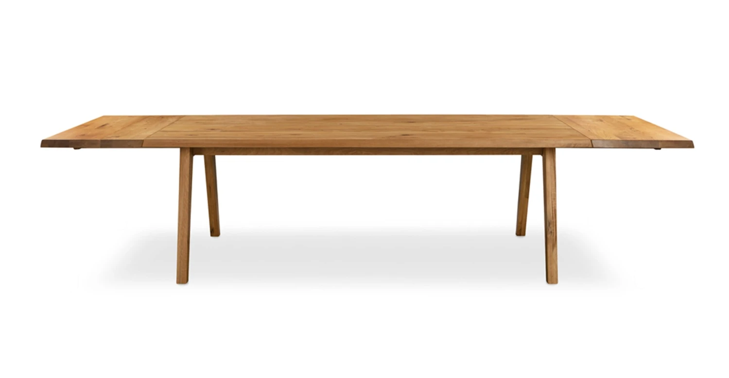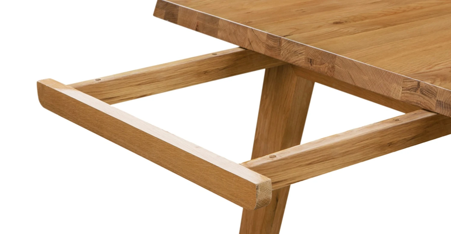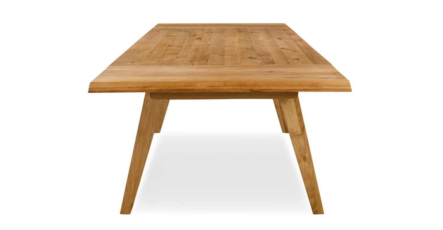 Made of solid American wild oak, the Savannah Dining Table exudes a homey charm thanks to a pale finish that highlights the rich, swirling grains of the wood. But its clean-lined design and subtly angled legs and tabletop edges are all elegance, making this table perfect for more formal occasions, depending on how you dress it up. An attachable leaf at either end for extra guests lets the Savannah seamlessly slide from family meal to festive party in no time.