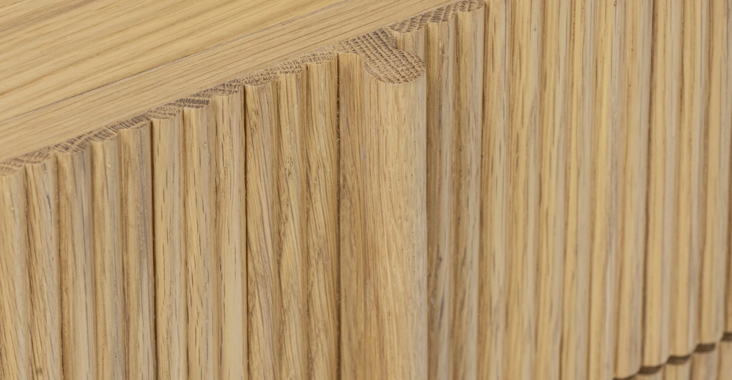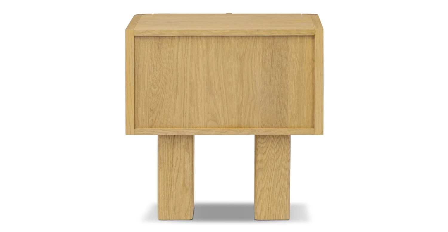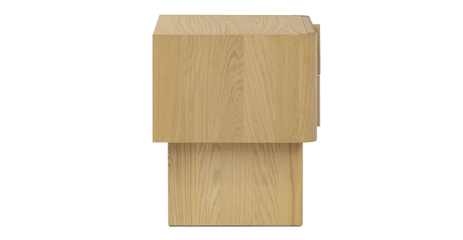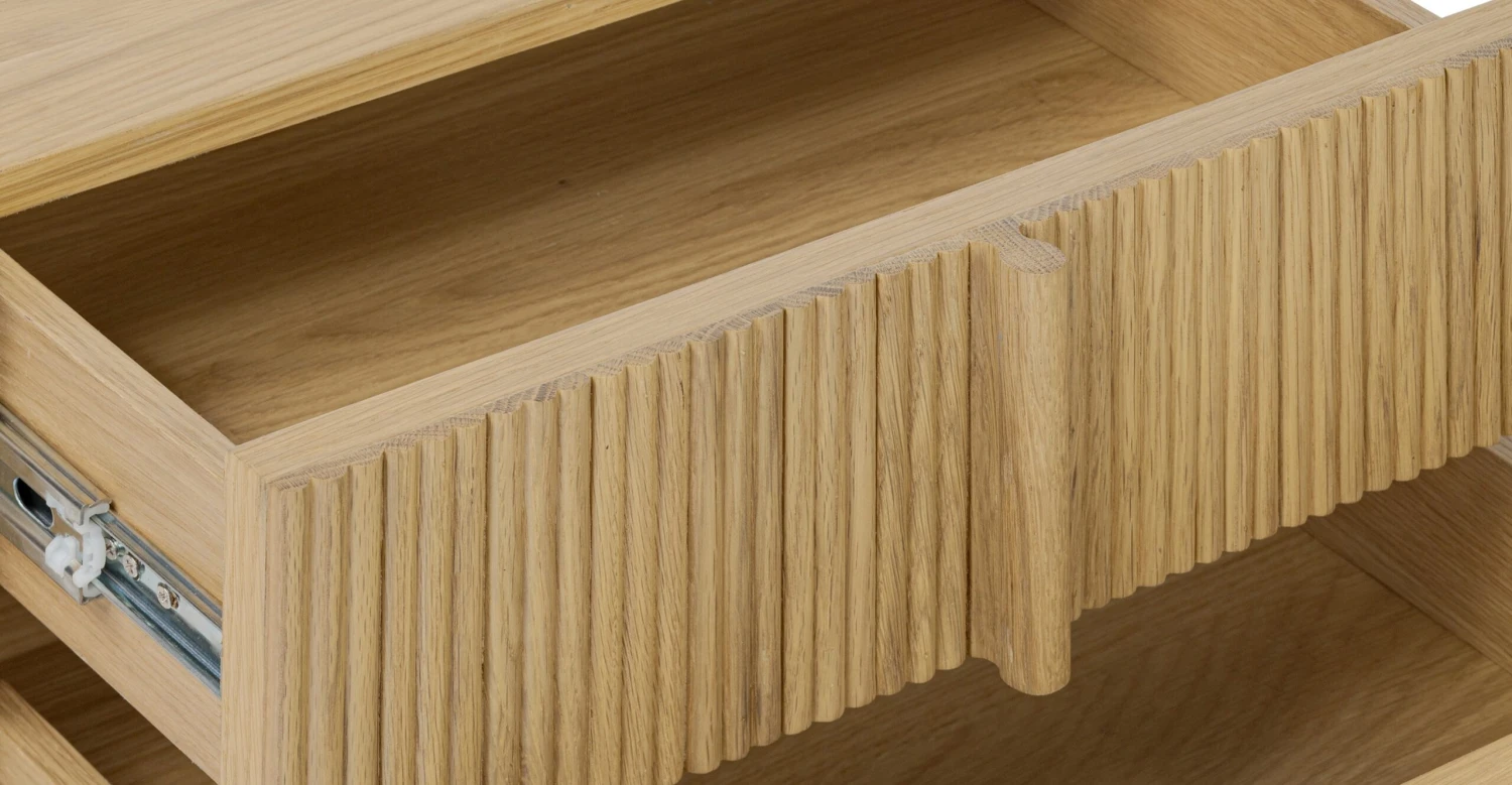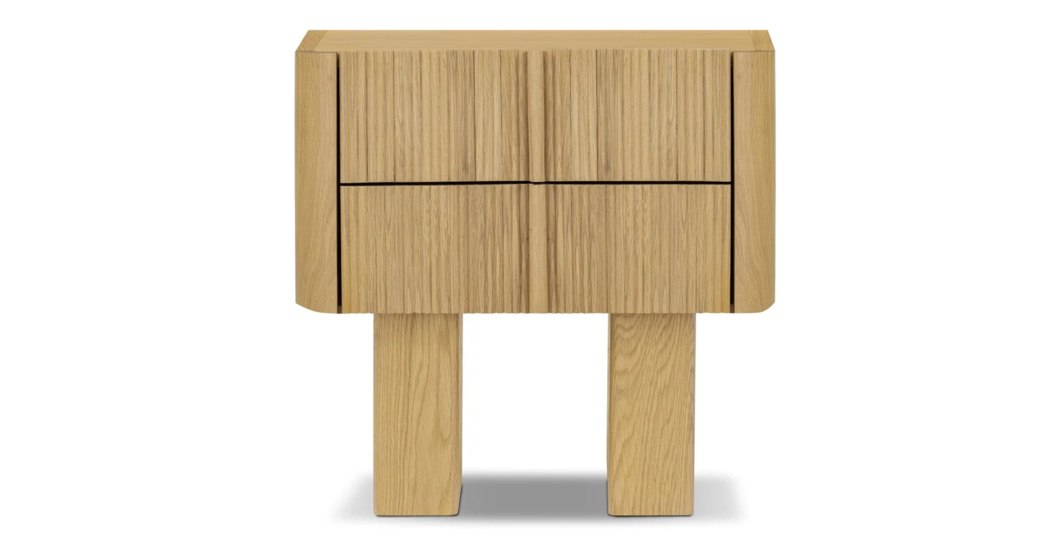Crafted from solid and veneered American white oak, the Toledo nightstand is a tactile treat with ribbed drawer fronts. Soft-closure drawers and carved pulls add charm, while natural wood variations make each piece unique. Easy assembly in minutes. It’s not just furniture; it’s a textured treasure hunt for your bedside.